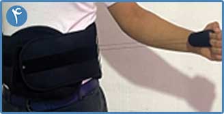 1- همه بندهای چسبی محصول را باز کنید. دستگیره را نزدیک مکانیزم قرقره ها قرار دهید و پدهای خلفی را در طرفین پنل پشتی قراردهید. سپس محصول را دور کمر خود بپیچید به نحویکه دستگیره آن در سمت چپ بدن شما بوده و مکانیزم قرقره ها و پنل پشتی در وسط کمر شما در پشت مطابق شکل قرار گیرد. سپس دو طرف کمربند را با دو دست خود کاملاً بکشید.