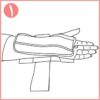 1- تمامی بندهای چسبی زبر و نرم محصول را باز کنید، توجه داشته باشید آتل کف دست محصول قابلیت جدا شدن و جابه جایی را دارد، لذا می توان آنرا برای استفاده از این محصول بر روی دست چپ یا راست جابه جا نمود، بنابراین در صورت نیاز آن را جابه جا نمایید. پس از آن دست خود را مطابق شکل در داخل مچ بند قرار دهید و انگشت شست خود را از سوراخ شست عبور دهید. توجه داشته باشید قسمت گود آتل این مچ بند باید روی مرکز گودی کف دست شما قرار بگیرد.