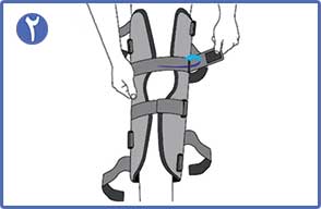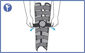 4. Secure patellar pad. Check it for proper fit. The patellar opening should be directly over the kneecap and the brace should not slip when the patient stands. Try to walk while wearing the knee immobilizer to better assess the fit. If the brace slips, sit back down and start at the beginning, pulling the straps tighter.Table of Size: