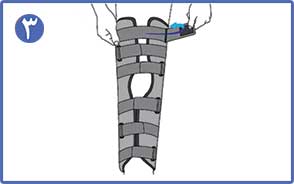 2. Lift and swing the affected leg until it rests on top of the brace, keeping the leg straight. Adjust the brace under the leg, so the patellar opening in the middle lines up with the kneecap.