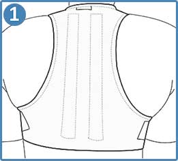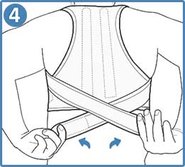 1 Unfasten hooks and loops and straps. Then place the brace across the back, as if putting on a jacket and place the shoulder strap of the brace over the shoulders.
